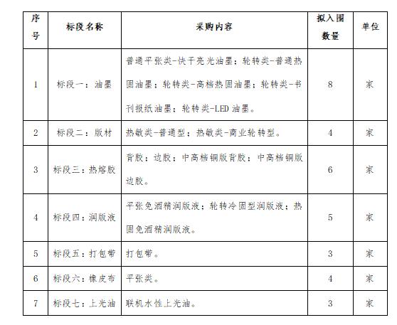 三、征集項(xiàng)目簡介:本項(xiàng)目征集人為中南出版?zhèn)髅郊瘓F(tuán)股份有限公司(以下簡稱“征集人”),湖南省印刷物資有限責(zé)任公司(以下簡稱“采購人”)根據(jù)征集結(jié)果實(shí)施采購,承擔(dān)框架協(xié)議和采購合同的簽訂與執(zhí)行。本次采購范圍為主要印刷輔料,涵蓋油墨、版材、熱熔膠、潤版液、打包帶、橡皮布、上光油七大類,劃分為7個標(biāo)段。若某標(biāo)段通過資格審查的供應(yīng)商數(shù)量小于擬入圍家數(shù),為保證項(xiàng)目競爭性,推薦入圍供應(yīng)商數(shù)量縮減為N-1,其中N是指通過資格符合性審查的供應(yīng)商的數(shù)量,征集人也有權(quán)針對該標(biāo)段重新組織采購。具體標(biāo)段劃分如下: