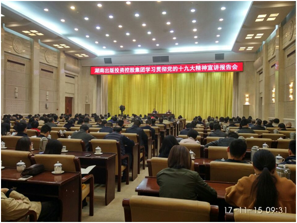 11月15日上午,湖南出版投資控股集團(tuán)學(xué)習(xí)貫徹黨的十九大精神宣講報(bào)告會(huì)在九所賓館會(huì)議中心舉行。黨的十九大代表、湖南新聞出版廣電局黨組書記朱建綱應(yīng)邀作輔導(dǎo)報(bào)告,集團(tuán)黨委書記、董事長(zhǎng),中南傳媒董事長(zhǎng)龔曙光主持會(huì)議。集團(tuán)黨委領(lǐng)導(dǎo)、中南傳媒高管、子分公司全體集團(tuán)管理干部、控股集團(tuán)和中南傳媒總部員工共300余人參加會(huì)議。